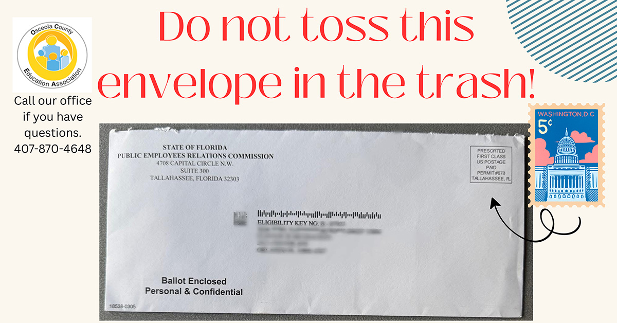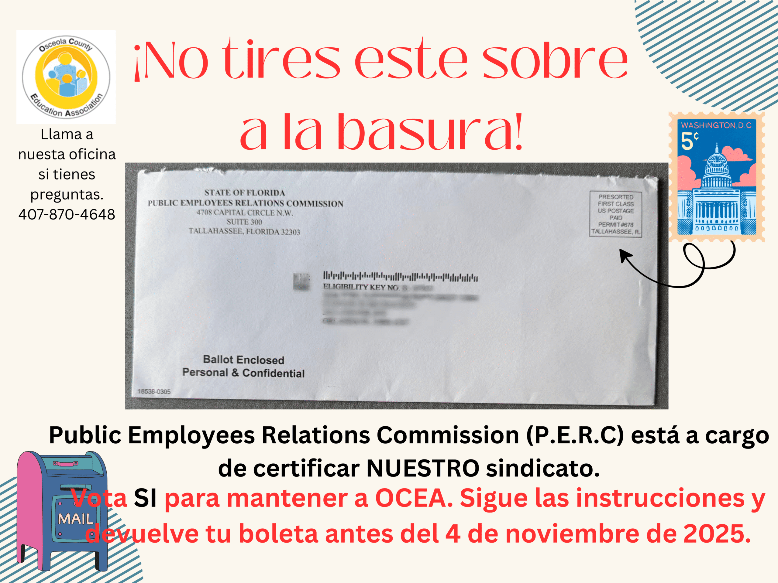It’s time again to tell the State of Florida that our union is here to stay. Starting in October, all employees in the bargaining units will receive an envelope from the Public Employees Relations Commission (PERC). It’s crucial that you don’t throw this envelope away! Please open it, follow the instructions, and return your ballot before November 4th, 2025.