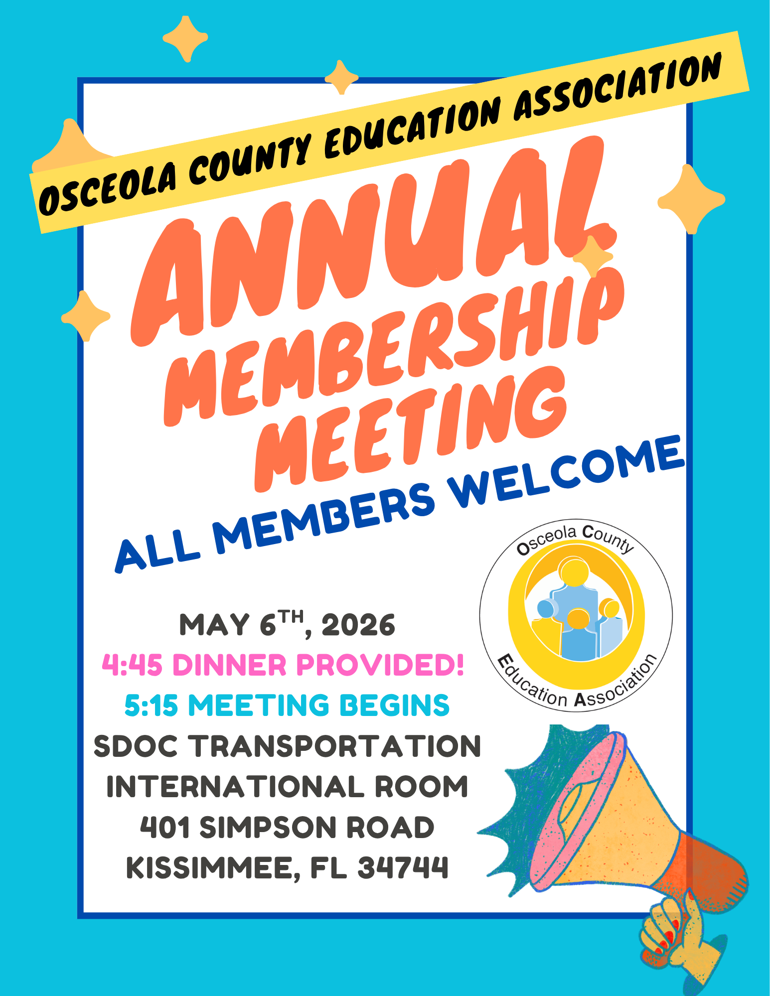 We’re excited to invite all members to the Osceola County Education Association (OCEA) Annual Membership Meeting! This important gathering will take place on May 6th, 2026, at the SDOC Transportation International Room, located at 401 Simpson Road, Kissimmee, FL 34744.